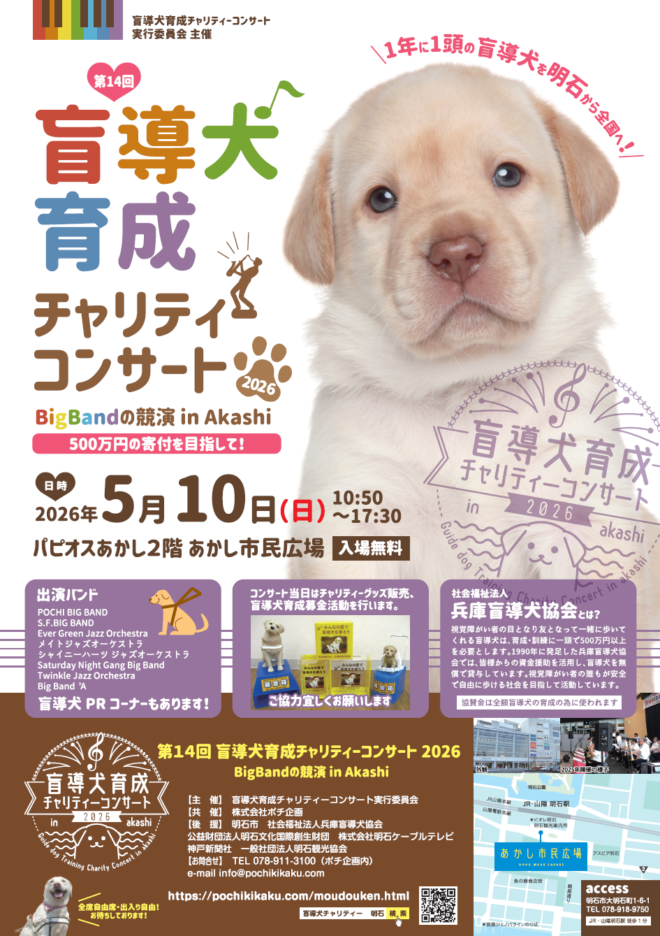 第14回盲導犬育成チャリティコンサート開催のお知らせ 2026.03.30 「第14回盲導犬育成チャリティコンサート」を下記日時で開催します。 当社でも盲動犬育成の趣旨に賛同し、チャリティに協賛しています。 是非、皆様お気軽に盲導犬育成チャリティコンサートにご参加ください!! 詳細なイベント情報は下記ポスターをご確認お願いいたします。 導犬ポスターA3 2026.3.17